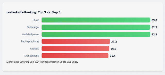 Während die Unterhaltungsindustrie, Bundesliga und Kraftstoffindustrie das Ranking anführen, bilden Krankenhäuser das absolute Schlusslicht. Pharmaindustrie und Ärzte liegen ebenfalls auf hinteren Plätzen. Mit einem durchschnittlichen Lesbarkeitsindex von nur 36,4 auf der Skala von 0 bis 100 Punkten bilden deutsche Kliniken das Schlusslicht im Ranking. Der Gesamtdurchschnitt aller Branchen liegt bei 47,6 Punkten.
